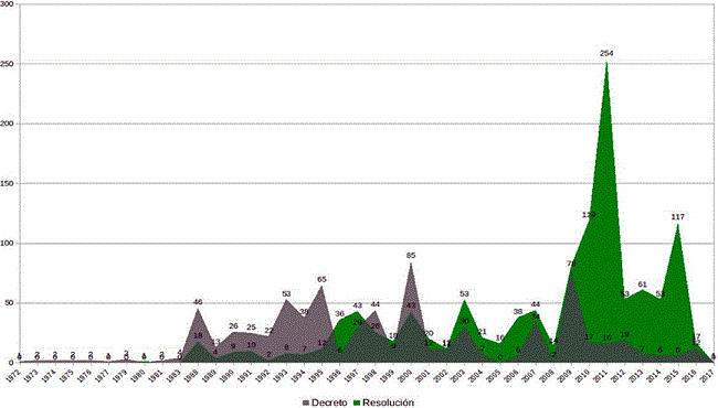 Como puede apreciarse en la Figura 8, la cantidad de decretos es mucho menor que la cantidad de resoluciones. Desde la creación de la ley 19.640 los decretos han mantenido una tendencia con pocas oscilaciones, excepto en años particulares directamente asociados a los periodos que caracterizan las etapas: 1989, 1995, 2000, 2009. Este tipo de normas cambian el rumbo de la política industrial y del régimen de promoción. La Figura 7 muestra claramente la relevancia de este bloque de normas en particular, muy notoriamente sobre el resto de las categorías, en especial en términos de capacidad de reformar la naturaleza del régimen.