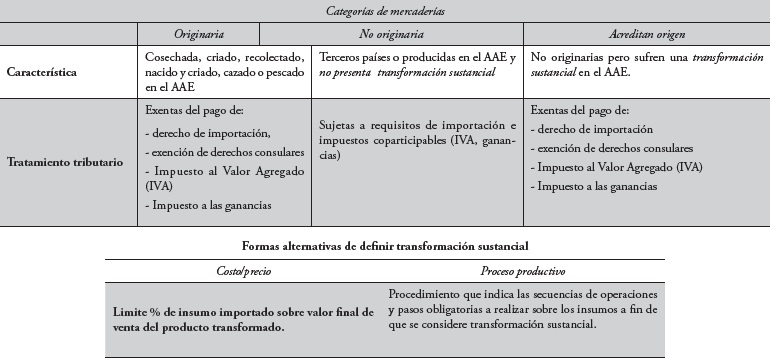 Las mercaderías no originarias del AAE son aquellas procedentes de terceros países, o aquellas que siendo procesadas en el AAE no presenten una transformación sustancial; las mismas están sujetas a todos los requisitos de importación, impuestos coparticipables y cualquier tasa o gravamen, por ejemplo, el caso de indumentaria importada de terceros países.