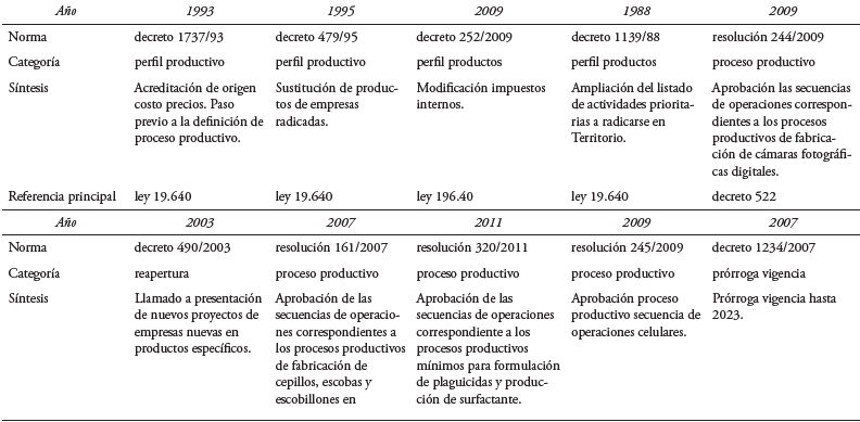 Otro elemento fundamental tiene que ver con la morfología normativa del Régimen de Promoción (Figura 2), en este sentido, este artículo versa sobre el análisis del conjunto de normas que componen dicho régimen, aunque el mismo sea usualmente asociado sólo con la ley 19.640, que ofrece el marco inicial (de los años setenta) para el desempeño del régimen de promoción industrial pero poco puede decirnos acerca de su evolución.