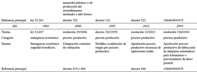 Durante los noventa, Argentina atravesó por un fuerte periodo de restructuración y transformación de modelo económico (Schorr, 2013). Entre los principales cambios que afectaron a la región se encuentra el decreto 1737/1993 (Infoleg, 1993), que determinó un límite de 50% a los componentes importados para la fabricación de productos en el área aduanera especial y la necesidad de implementar una metodología basada en procesos productivos, para que se comprobara la transformación sustancial de las materias primas importadas.