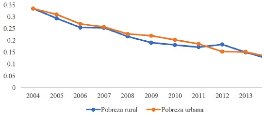 Para se ter uma dimensão da evolução da pobreza nos anos analisados no presente trabalho, a Figura 2 demonstra a proporção média de pobres nos meios urbano e rural do Brasil entre 2004 e 2014. Observa-se que no referido período a proporção média de pobres regrediu, passando de cerca de 35% da população em 2004 para pouco mais de 10% em 2014 em ambas as situações censitárias estudadas.