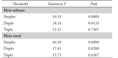 A quantidade de regimes a ser utilizada é testada por meio de um teste F de acordo com a especificação de Hansen (1999), os resultados desse procedimento estão esboçados na Tabela 2. O que se pode concluir a partir da estatística F é que tanto no meio urbano quanto no meio rural deve ser considerado um duplo threshold, uma vez que o valor da estatística para um triplo threshold pertence ao intervalo de não rejeição da hipótese nula de inexistência de efeito threshold.