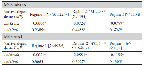 Para o primeiro regime, os coeficientes obtidos para o meio urbano indicam que o aumento de 1% na renda per capita gera uma redução de 0.0604% na proporção de pobres, enquanto um aumento de 1% na desigualdade de renda eleva a pobreza urbana em 0.2385%. Já no segundo regime, a elasticidade-renda foi de -0.0724 indicando que o aumento de 1% na renda per capita urbana reduz a pobreza do meio urbano em 0.0724%. A elasticidade-desigualdade para o segundo regime foi de 0.4455, indicando que uma elevação de 1% na desigualdade de renda eleva a pobreza urbana em 0.4455%. Já no terceiro regime, que indica as unidades da federação com renda per capita superior a R$ 1134.00, as elasticidades encontradas indicam que o aumento de 1% na renda reduz a pobreza urbana em 0.0759%, enquanto o aumento de 1% na desigualdade de renda eleva a pobreza em 0.6762%.