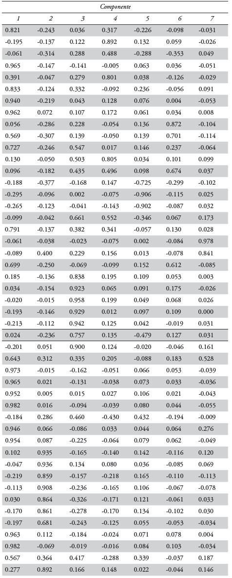 La rotación varimax ofrece resultados cuyos valores se leen en términos absolutos y se encuentran en un rango que va del 0 al 1. Estos valores son indicativos del grado de pertenencia de cada variable a cada agrupamiento identificado, en este caso, la variable se representa por el subsector. Consecuentemente, la unidad constituye la dependencia absoluta en contraposición al cero, que se traduce como la independencia absoluta. La metodología prevé la posibilidad de que un solo subsector pertenezca simultáneamente a dos o más agrupamientos, lo cual incluso es deseable desde el análisis económico, puesto que es evidencia de la interdependencia del conjunto del aparato productivo (Rey y Mathheis, 2000).