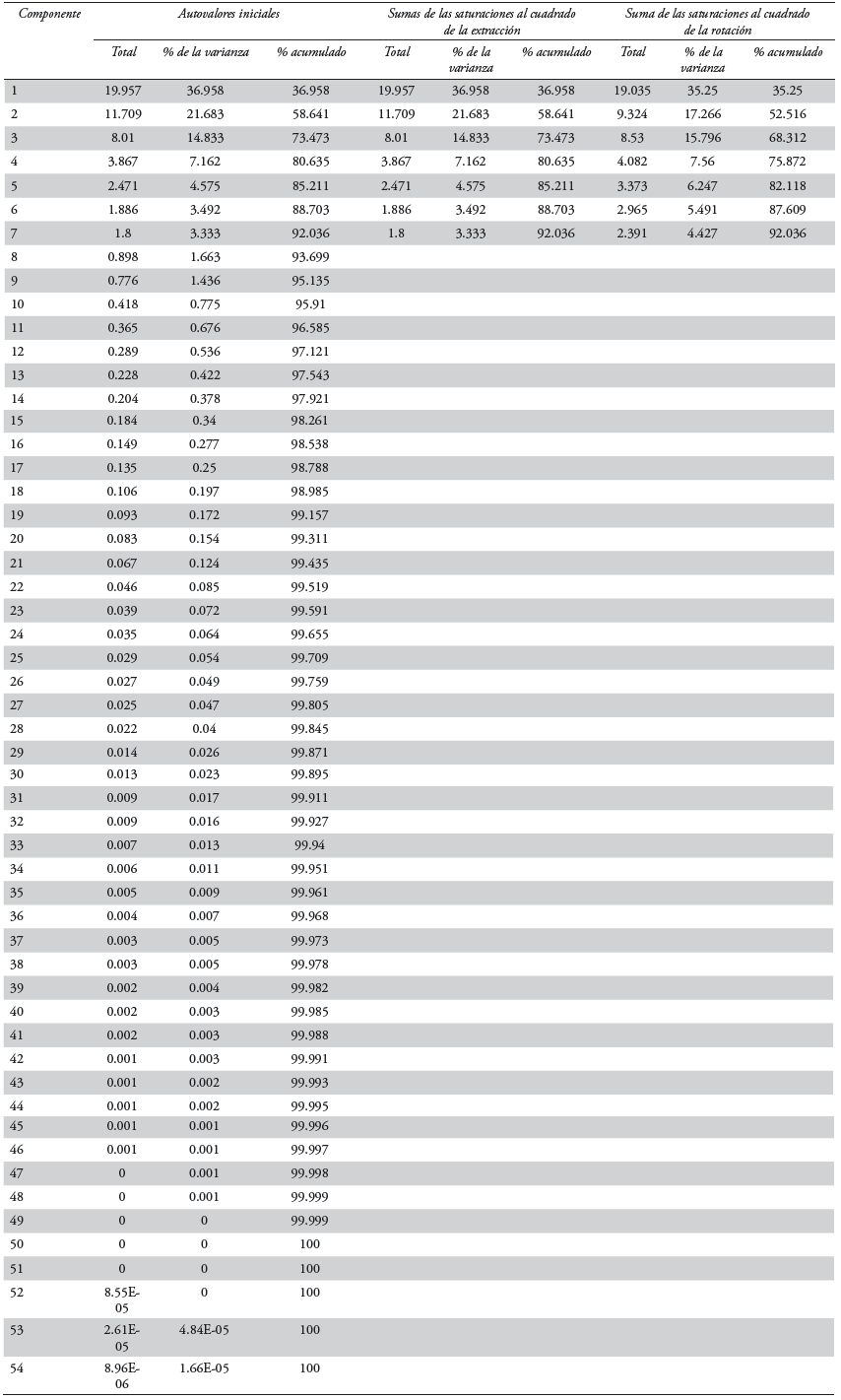 La aplicación del análisis de factores y componentes principales, expresado en la matriz de componentes rotados (ver en los anexos el Cuadro A1), arrojó siete columnas correspondientes al mismo número de agrupamientos identificados. Se trata, por tanto, de una matriz con tantas filas como sectores de actividad económica que tienen presencia en el estado de Hidalgo (54 subsectores) y tantas columnas como agrupamientos identificados (siete agrupamientos). Para el caso nacional, Dávila (2005) identificó 13 agrupamientos industriales y para la región noreste del país -Coahuila, Nuevo León y Tamaulipas- Dávila (2008) ubicó seis agrupamientos con mayor relevancia. Tales resultados se expresan en la varianza total explicada por componente contemplado en el modelo, lo cual permite identificar los factores denotativos de los agrupamientos industriales identificados. Los elementos de la varianza total explicada, así como sus estadísticos descriptivos se presentan en los anexos en los Cuadros A2 y A3, respectivamente.