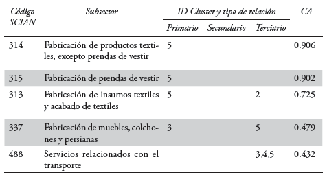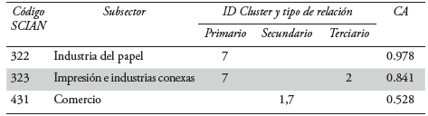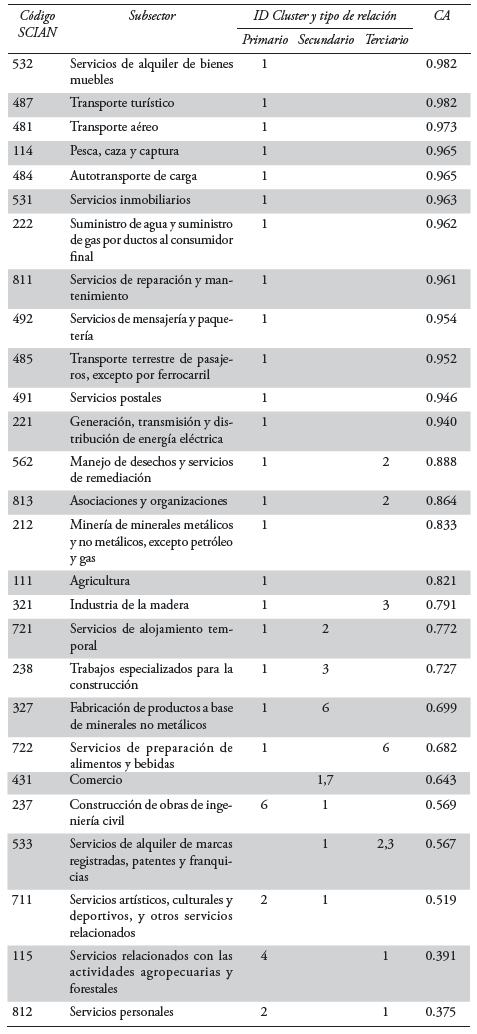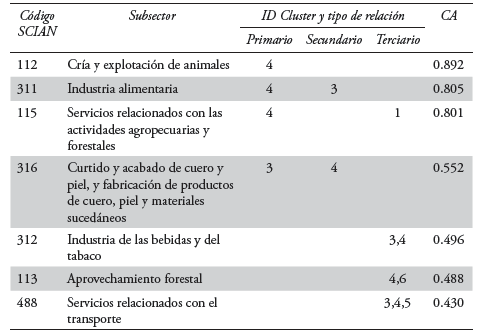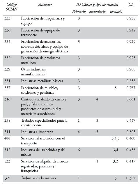 Los resultados que se expresan en lo sucesivo se resumen tabularmente en seis columnas, la primera representa el codificador SCIAN, la segunda el nombre del subsector al que hace referencia. Las tres siguientes columnas expresan el tipo de relación que cada subsector tiene para con el agrupamiento en cuestión; de esta manera, un mismo subsector puede pertenecer, simultáneamente, a dos o más agrupamientos. Esto es congruente con el principio lógico difuso que rige a la técnica de factores y componentes principales; según el cual, pueden existir actividades aparentemente no relacionadas, por su naturaleza productiva, con cada agrupamiento productivo y que, sin embargo, lo están por el grado de interrelación e integración comercial; el razonamiento que se sigue en los resultados es dejar que los datos y el procesamiento de los mismos sean los protagonistas.6 La sexta y última columna recoge los valores de los Coeficientes de Asociación (CA) o loadings que, como ya se ha referido, son indicativo del grado de pertenencia de cada subsector a cada agrupamiento, y cuyo significado se expresa bajo los términos referidos al inicio del presente subtema.