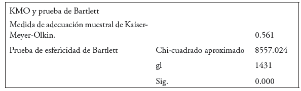 Con el propósito de demostrar la viabilidad de la aplicación del análisis factorial se precisa, en primera instancia, llevar a cabo el test KMO (Kaiser, Meyer y Olkin), cuya finalidad es medir la adecuación del conjunto de datos mediante la comparación de los valores de correlación simple con respecto a los indicadores de correlación parcial expresando ambos términos en su forma cuadrática. Se espera que los componentes de dicho ratio sean razonablemente parecidos con lo que el test KMO tiende a la unidad, lo cual es sintómatico de la opción de continuar con el análisis factorial. Acorde con el fundamento teórico multivariante de los factores y los componentes principales, los valores de 0.5<KMO<1 indican que es apropiado aplicar el analisis factorial a la matriz que constituye el objeto de estudio. De manera complementaria, la prueba de esfericidad de Bartlett verifica si se acepta o rechaza la hipótesis nula de esfericidad que implicaría que las variables no están correlacionadas en el universo de datos3 (Montoya-Suárez, 2007). Los resultados de ambos estadísticos se muestran a continuación en el Cuadro 1 donde se presenta un KMO con valor de 0.561 y un p-value para el Test de Bartlett de 0.000 lo que permite rechazar la Hipótesis Nula. Ambos resultados son concluyentes respecto a la posibilidad de continuar con el proceso de análisis factorial.