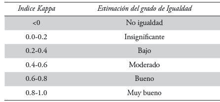 Donde P0 es la proporción de igualdad observada, Pe es la proporción de igualdad esperada y 1 - Pe representa la igualdad o concordancia máxima. Entonces, el numerador del Índice de Kappa de Cohen expresa la proporción de igualdad observada menos la esperada, en tanto que el denominador es la diferencia entre la igualdad total y la proporción esperada. Si este valor es igual a 1.0, estaríamos frente a una situación en que la igualdad entre los mapas es perfecta (100% de igualdad), cuando el valor es 0.0 los mapas tienen un parecido de cero (e.g. no se parecen en nada), y si el valor es -1.0 un mapa sería el inverso del otro (Viera, 2005; Jiménez et al., 2018).
