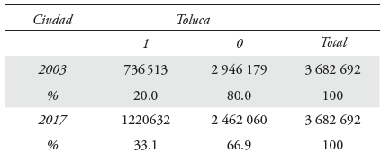 Los vectores de estado iniciales muestran el incremento o cambio de estado de pixeles en 2003 y 2017. Los que permanecen en 1 pasaron de 736,513 a 1,220,632 (un incremento de 11.1%) y los que permanecieron en 0 bajaron de 2,946,179 a 2,462,060 (una disminución de 13.1%). En total, en la ciudad de Toluca, los pixeles que cambiaron su estado, es decir: la mancha urbana que se modifica o crece, son 484,119 en 14 años (un aumento de 13.1%).