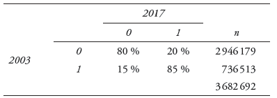 La construcción de la matriz de transición para 2003-2017 se genera por un conteo de cambios entre las dos categorías de pixeles de un año a otro. Basta consultar las aplicaciones de CHRISTALLER® y ordenar la información como se muestra en el Tabla 2.