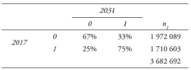 El principal cambio en el periodo 2003-2017 es que, 3,249,918 pixeles que se encontraban en la categoría de suelo no ocupado (i.e. pixeles en cero que permanecen en cero), equivalían a 80% del total. La proyección mostrada en la tabla 3 indica que para 2031 la probabilidad de que los pixeles permanezcan en esa categoría se reduce a 67%. La probabilidad de transitar de valor de cero a uno subiría de 20% a 33% y la de pasar de valor uno a cero van de 15% a 25%. En síntesis, la proyección sugiere una redistribución progresiva importante de condiciones para vivir/trabajar, por lo tanto existe mayor suelo ocupado que vacío.