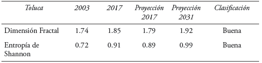 El índice de entropía de Shannon para Toluca en 2003-2017 y la proyección 2017 indica una buena distribución de pixeles con una diferencia de casi una décima, lo cual indica que la mancha urbana está creciendo de una forma adecuada (e.g. no crece en una zona, si no en todas las zonas del mapa). En la proyección realizada por el modelo de Cadenas de Markov espaciales al calcular la entropía existe un resultado muy cercano a uno: esto es muy interesante, porque, aparentemente, la velocidad de crecimiento de la mancha urbana es elevada, por lo tanto, el valor indica que está muy bien distribuido el crecimiento, esto es una conjetura que debe probarse considerando más ciudades.