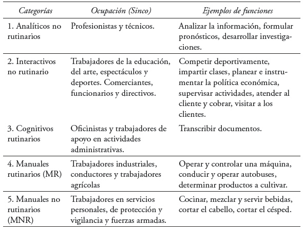 En un importante estudio sobre empleo y tecnología (Acemoglu y Autor, 2011) se han encontrado cambios en la distribución del empleo entre ocupaciones de diversos niveles de habilidad y las nuevas tecnologías, que sustituyen por máquinas tareas realizadas por trabajadores moderadamente calificados. A un nivel más desagregado, con enfoque en las tareas de cada ocupación, Autor et al. (2003) y Spitz-Oener (2003; 2006) encontraron que la tecnología informática sustituye a los trabajadores en la realización de tareas rutinarias que pueden describirse fácilmente con reglas programadas, además complementa a los trabajadores en la ejecución de tareas no rutinarias que exigen resolución de problemas y comunicaciones complejas. La investigación de Larsson (2017), complementariamente, demuestra que las actividades no rutinarias se concentran en los distritos centrales de negocios.