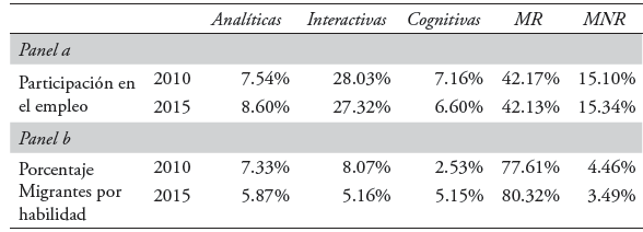El Cuadro 2 muestra la suma del empleo en las tres categorías de las habilidades no rutinarias (v. gr. analíticas, interactivas y manual no rutinarias) que ocupa, aproximadamente, 57% de la población empleada, mientras que la categoría manual rutinaria, por sí sola, ocupa 42% de la población empleada. Entre 2010 y 2015, los requerimientos de habilidades analíticas aumentaron, mientras que se mantuvieron relativamente sin cambios los requerimientos de habilidades interactivas y cognitivas (panel a). Se redujo la migración de empleados no rutinarios (v. gr. analíticas, interactivas y manual no rutinarias) y aumentó la migración de empleados rutinarios: cognitivos y manual rutinario (panel b). Asimismo, la migración respecto al empleo se duplicó entre 2010 y 2015. Más adelante se muestra que el patrón de migración por habilidades es distinto según el tipo de entidad federativa.