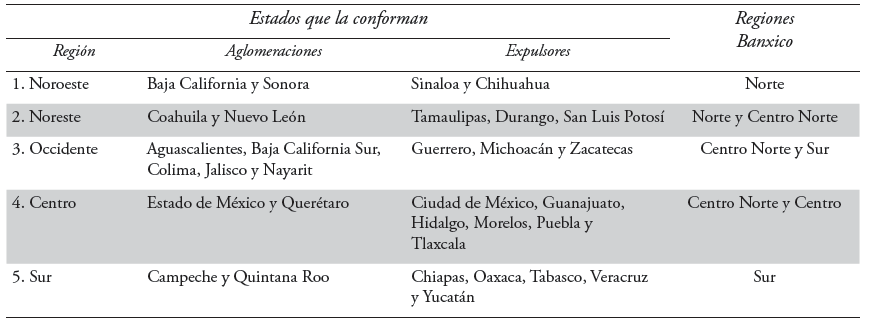 Adicionalmente, se identificaron las tres principales entidades expulsoras de la migración laboral hacia las entidades con aglomeraciones (Cuadro 3). Esta información permitió identificar que la migración laboral es regional, es decir, los migrantes se mueven a zonas cercanas a sus entidades de origen. Por ejemplo, Aguascalientes recibe migrantes de Zacatecas y Jalisco; Baja California de Sinaloa y Sonora; Campeche de Tabasco y Veracruz; Coahuila de Nuevo León y Durango. Así se construyeron las cinco regiones que se presentan en la Figura 1 y Cuadro 4.