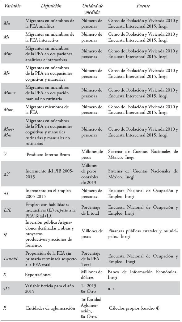 En el Cuadro 5 se proporciona la fuente y la información de las variables utilizadas en las estimaciones. Esto incluye las variables de migración, empleo y producción, y las variables ficticias utilizadas.