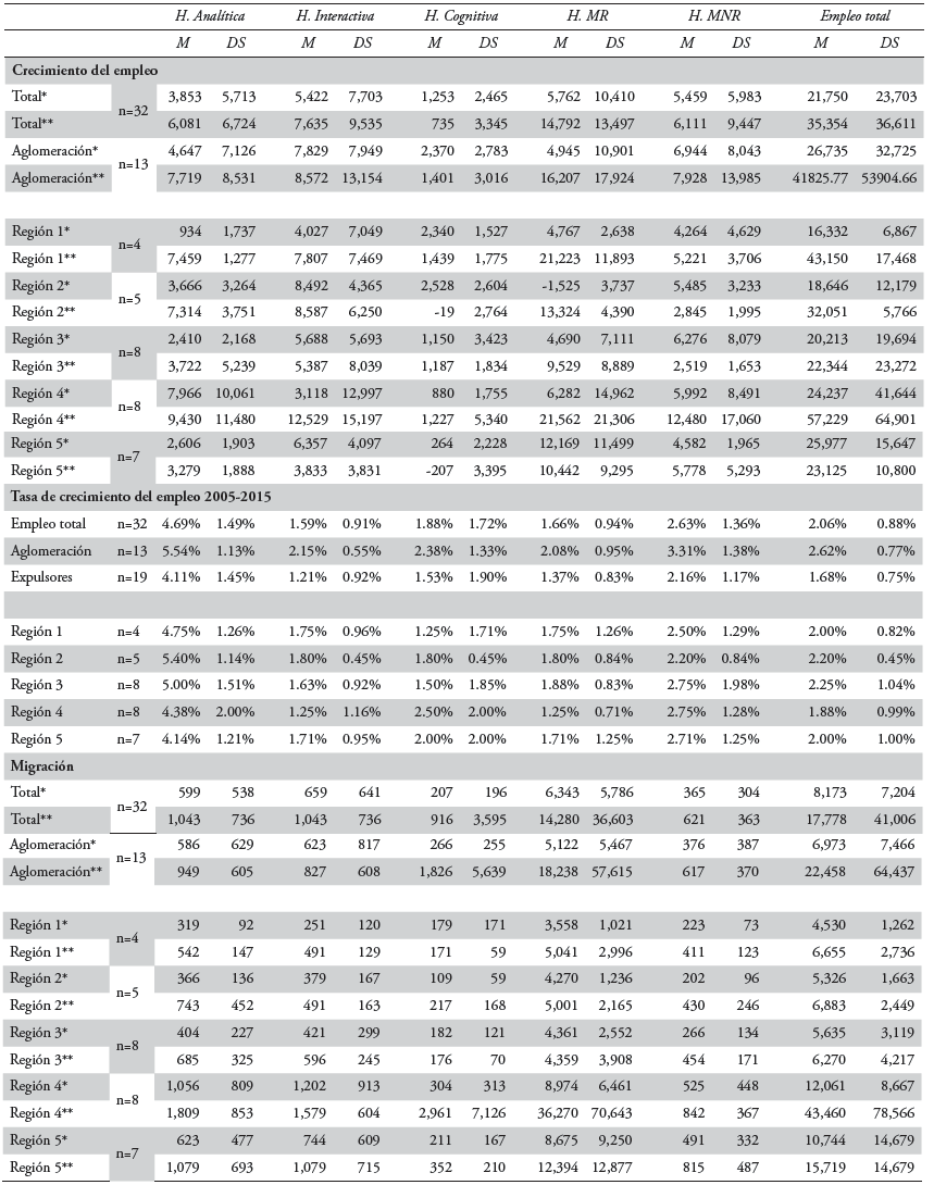 En el Cuadro 6 se presentan las estadísticas del empleo y la migración en las entidades con aglomeraciones y, a su vez, en todas las regiones en los periodos 2005-2009 y 2010-2015. Varias conclusiones pueden obtenerse. Por ejemplo, en las aglomeraciones se crean más empleos, la tasa de crecimiento del empleo es mayor y también es mayor el número de migrantes. En general, puede afirmarse que la tasa de creación de empleos es superior en las entidades de aglomeración respecto al promedio nacional.