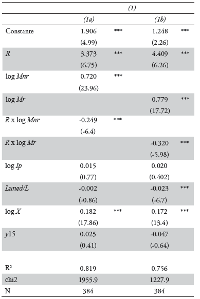 donde t = 2005 a 2016, R1 son las entidades clasificadas como aglomeraciones, log (Mnr) es el logaritmo de migración de la PEA no rutinaria, log (Mr) es el logaritmo de la migración de la PEA rutinaria log (Ip) es el logaritmo de la inversión pública, es la proporción de la PEA sin primaria respecto a la PEA total, log (X) es el logaritmo de las exportaciones estatales.