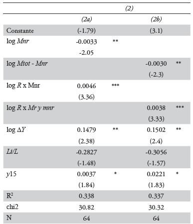 Los coeficientes de interés son α2 de la ecuación 1a -la migración no rutinaria- y α2 de la ecuación 1b -la migración rutinaria-, ya que muestran el efecto en el PIB de los migrantes con habilidades no rutinarias y rutinarias.