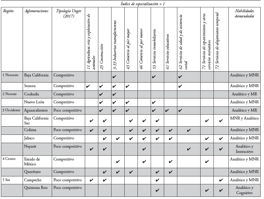 Con los datos del Cuadro 6 se encontró diferencia entre la demanda de habilidades que tienen las distintas entidades denominadas aglomeraciones. Se encontró que la especialización regional gira en torno a los requerimientos de empleados con altas habilidades. Mientras unas aglomeraciones emplean a trabajadores con habilidades analíticas (Baja California, Colima y Sonora), otras demandan habilidades interactivas, como ocurre en las zonas turísticas de playa, tales como: Baja California Sur, Nayarit y Quintana Roo.