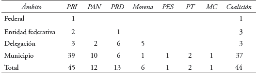 En el Estado de México, el Partido Revolucionario Institucional (PRI) gobierna en 38 municipios y 34 son producto de coalición, el Partido Acción Nacional (PAN) gobierna en 10 y tres son producto de una coalición, el Partido de la Revolución Democrática (PRD) gobierna en seis sin coalición, el Partido Movimiento Regeneración Nacional (Morena) gobierna en un municipio, el Partido Encuentro Social (PES) en uno, el Partido del Trabajo (PT) en dos, y el Partido Movimiento Ciudadano en uno. En Tizayuca, Hidalgo, el PRI gobierna como partido único. La ZMVM está integrada por 80 ámbitos de gobierno: 76 delegaciones y municipios, en 42 gobierna el PRI, en 12 el PAN, en 12 el PRD, en seis Morena, el PT en dos y el PES y MC en uno; dos entidades federativas son gobernadas por el PRI y una por el PRD; el ámbito federal es gobernado por el PRI. El gobierno en la ZMVM fue resultado de 40 coaliciones en el ámbito local, así como en las tres entidades federativas y la presidencia de la república (Tabla 1).