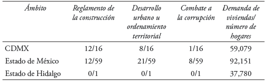Según cifras del Instituto del Fondo Nacional de la Vivienda para los Trabajadores (Infonavit, 2017), 90% de las viviendas económicas se construyen en reserva territorial adquirida por desarrolladores a particulares y no en reservas del Estado, esto hace que sus costos se incrementen. En los municipios que se encuentran en la zona norte de la ZMVM (Tabla 3) se reportan 2,532 viviendas vendidas, de éstas, sólo dos cuentan con reglamento de la construcción: Cuautitlán Izcalli y Huehuetoca. Con reglamento de desarrollo urbano u ordenamiento territorial sólo tres: Huehuetoca, Teoloyucan y Cuautitlán Izcalli. Con reglamento de combate a la corrupción sólo tres: Teoloyucan, Tonanitla y Zumpango. En la zona oriente se reportan 388 viviendas vendidas; en esta área, las delegaciones de la CDMX que cuentan con reglamento de la construcción son tres: Iztapalapa, Tláhuac y Xochimilco; ningún municipio cuenta con este reglamento. Sólo cuentan con reglamento de desarrollo urbano u ordenamiento territorial la delegación de Iztapalapa y los municipios de Chalco y Tlalmanalco. Con reglamento de combate a la corrupción sólo la delegación de Iztapalapa y municipio de Chalco. En la CDMX sólo la delegación de Iztapalapa cuenta con disposiciones normativas para el combate a la corrupción, mientras que sólo ocho de los 59 municipios del Estado de México cuentan con reglamentación (Tabla 3).