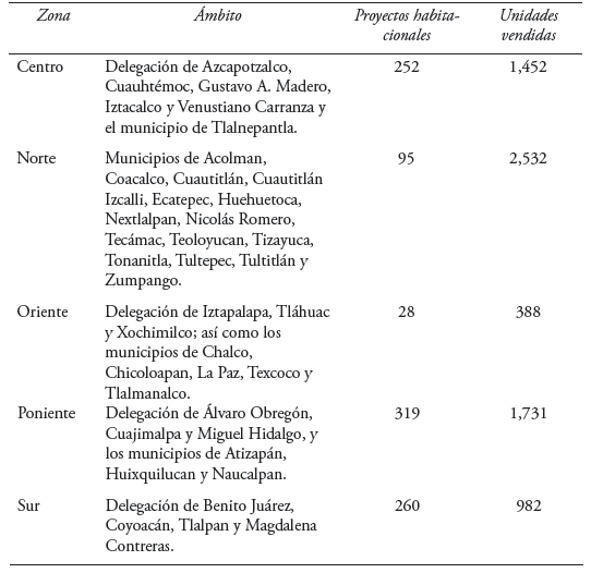 La Compañía Multinacional de Valuación y Servicios Integrales de carácter inmobiliario (Tinsa) reportó, en el cuarto trimestre del 2016, 7,101 unidades vendidas, 47% de ese total correspondió a la Ciudad de México y 53% a los municipios conurbados. El reporte indica que la zona norte concentró el mayor volumen de ventas, al participar con 43% del total. Es también el área que concentra la mayor oferta, principalmente en los segmentos bajos de vivienda. En las zonas centro, poniente y sur se concentra el mayor número de proyectos de construcción: 63% del total de desarrollos activos. La demanda de viviendas en la CDMX es de 59,079 y para el Estado de México de 37,780 en el año de referencia.
