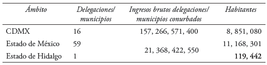 La relación formal entre los ámbitos de gobierno no es simétrica, de manera empírica, la relación entre los ámbitos nacional y local y el número de unidades de gobierno generan una fragmentación. Las 76 unidades locales, las tres unidades estatales y la federal que conforman la ZMVM atienden a 63.8 millones de habitantes. La CDMX cuenta con 8,851,080 habitantes y con 157,266 millones de pesos como ingreso bruto, mientras que los 59 municipios del Estado de México y el de Tizayuca, Hidalgo, albergan a 11,287,743 habitantes, con un ingreso bruto de 21,368 millones de pesos. De acuerdo al INEGI, en 1950, 43% de la población en México vivía en localidades urbanas; para 2010 esta cifra aumentó a 78%. Por otro lado el porcentaje de personas que habitaban en comunidades rurales en 1950 representaba 57% del total de la población del país y para el 2010 esta cifra disminuyó hasta ubicarse en 22%. En el año 2016, la ZMVM contaba con 20,400,000 habitantes (Tabla 4).