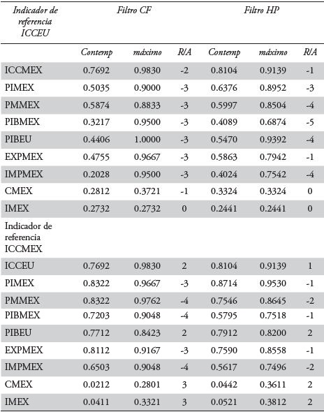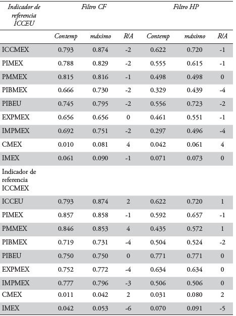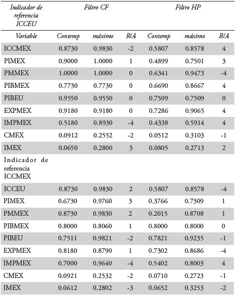 De esta manera, si el indicador del ciclo de alguna de las variables cambia después de que lo hace el indicador del ciclo de referencia, sea ICCMEX o ICCEU, se dice que lo sigue. Esto es, la variable xit sigue al ciclo yt+1 por j periodos si |p(j)| alcanza su máximo valor para un j<0 (rezago). A su vez, si el componente cíclico xit se mueve antes que el indicador del ciclo de referencia yt+1 se dice que lo antecede, es decir, la variable xit antecede al ciclo yt+1 por j periodos si |p(j)| alcanza su máximo valor para un j<0 (adelanto). Finalmente, yt es contemporánea al ciclo cuando |p(j)| alcanza su valor máximo en j = 0.