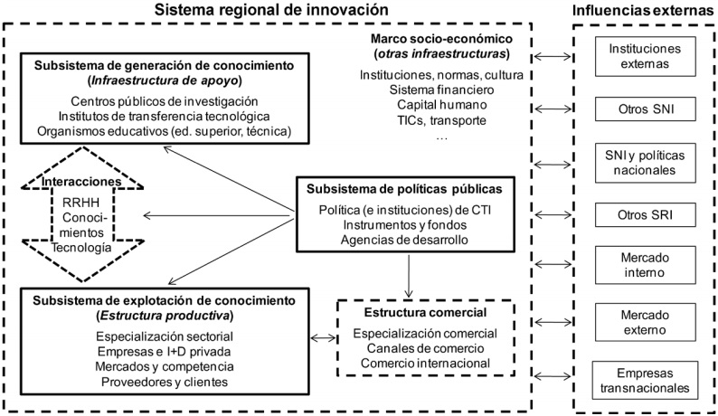 Según Cooke (2004), el SRI se compone de un subsistema de generación de conocimiento (i.e. la infraestructura institucional de apoyo), un subsistema de explotación de conocimiento (i.e. la estructura productiva regional) y las interacciones que se producen entre ellos, así como también con otros sistemas regionales, nacionales y globales. Tödtling y Trippl (2005) añaden un tercer subsistema: el de política regional, y señalan además que todos se encuentran inmersos en un marco socioeconómico y cultural regional (Figura 1).