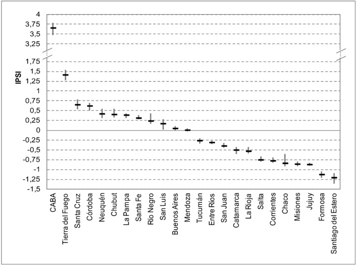 Lo anterior no se debe estrictamente al recorte y análisis de algunos años específicos, sino que la baja variabilidad del valor del IPSI para las distintas provincias argentinas es una característica de todo el periodo. Esto queda de manifiesto en el Gráfica 1, que además del promedio del IPSI para los 11 años incluye los valores mínimos y máximos alcanzados en cada caso. En la mayoría de las jurisdicciones la distancia entre puntas es despreciable, mientras que las diferencias más grandes rondan apenas una cuarta parte del desvío estándar general (i.e. 0.25).