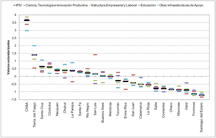 En el medio entre estos grandes grupos se encuentran las restantes cuatro provincias: dos de ellas (Buenos Aires y Mendoza) con un IPSI prácticamente nulo y subíndices también próximos al cero (si bien un poco por arriba o por abajo); San Luis, con un IPSI positivo pero subdimensiones repartidas entre los dos planos (y, especialmente, un elevado valor en materia de CTI); y Tucumán, con un IPSI negativo, al igual que todas las provincias norteñas, aunque a diferencia del resto es la única con subíndices de CTI y educación levemente positivos.