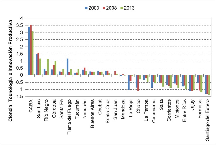Como veremos en las siguientes gráficas, el subíndice de CTI es el que parece evidenciar más cambios a lo largo del periodo. Varias son las provincias que mejoran en términos relativos entre 2003 y 2013 (Gráfica 3): en el plano positivo, se incrementan los valores de Río Negro, Córdoba y, en menor medida, Santa Fe y Tucumán; por el lado negativo, se achican las brechas de La Rioja, Chaco y Catamarca.