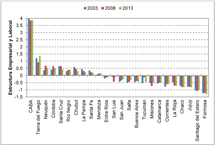 Por otra parte, Tierra del Fuego es la que más terreno cede, mientras que la CABA y San Luis (las dos primeras) experimentan cierta caída en su índice. En el extremo opuesto, seis de las siete provincias peor posicionadas (según los valores de 2013) han visto empeorar relativamente su situación, lo cual muestra la persistencia de profundas desigualdades.