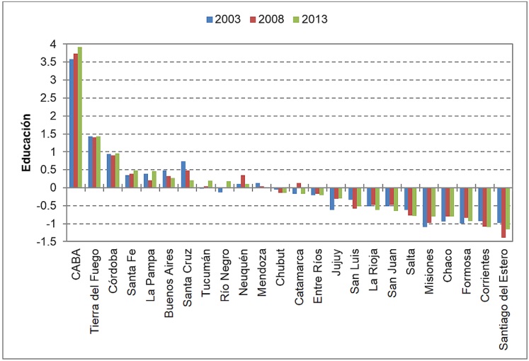 Cabe destacar que en un trabajo previo, que apuntaba a constatar la evolución de las brechas regionales y provinciales de desarrollo educativo entre inicios y fines de los años 2000, nos encontramos con un panorama muy similar (Niembro, 2014). Si bien allí utilizamos variables un poco diferentes (por ejemplo, indicadores de calidad educativa y tasas para el nivel primario), las provincias del Centro y la Patagonia tendían a ubicarse en el plano positivo (con la CABA, Tierra del Fuego y Córdoba a la cabeza), mientras que las norteñas junto con San Juan y San Luis presentaban brechas negativas (con Santiago del Estero en el último lugar). Asimismo, el coeficiente de vulnerabilidad educativa que calculan Steinberg et al. (2011) presenta un patrón territorial muy parecido al descripto.