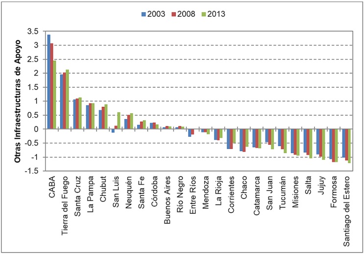 La situación de las otras infraestructuras de apoyo no es muy diferente a la de las anteriores subdimensiones del IPSI y el panorama territorial también se mantiene. Lo más sobresaliente de la Gráfica 6 es la evolución ascendente de San Luis, la cual puede atribuirse en parte a las reconocidas políticas provinciales en el área comunicacional (ver Finquelievich y Prince, 2010).