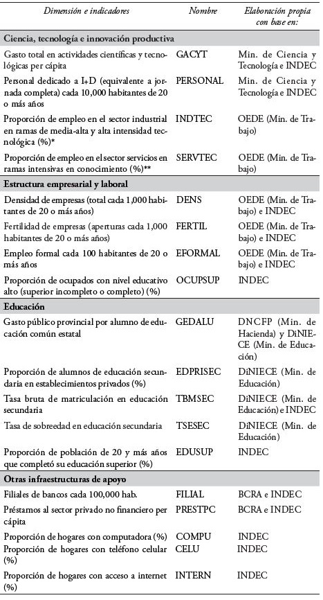 El sentido de esta forma de clasificación es que cuenta con dimensiones medianamente parejas en cantidad de indicadores como para descomponer al índice sintético general y agregar algunas discusiones extras al análisis. Esto es similar a varios de los trabajos previos que elaboraron índices regionales de innovación y que también definieron de manera temática los distintos subíndices o pilares que los componen (Ruiz Durán, 2008; USEDA, 2009; DNP-OCyT, 2015; Slaper et al., 2016).