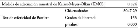 El uso del análisis de componentes principales se sustenta en la presencia de numerosas y elevadas correlaciones entre las variables (Hair et al., 2010). Por ello, también se obtiene una medida KMO superior a 0.80 (meritoria, según Kaiser, 1974) y se cumple con la prueba de esfericidad de Bartlett (Cuadro 2).