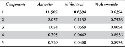 En el Cuadro 3 se presentan los autovalores y la varianza explicada por los primeros cinco componentes. Allí se observa que el primero de los componentes principales da cuenta de casi dos tercios de la variabilidad total, un nivel o piso satisfactorio para estudios en ciencias sociales, según Hair et al. (2010). Como adelantamos, en línea con los trabajos previos de Sterlacchini (2006) y Dos Santos (2017), optamos por retener únicamente a este primer componente y calcular su respectivo factor score para llegar así al IPSI.