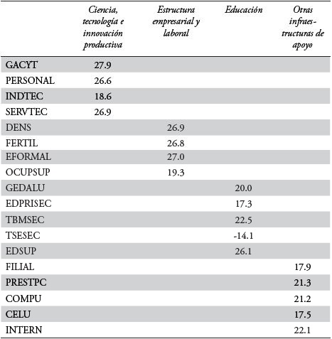Por último, entre otras infraestructuras de apoyo, reconocemos la importancia de la cobertura y profundidad del sistema financiero y del acceso, manejo y utilización de las TIC4. Estos aspectos también cuentan con respaldo de trabajos previos (Martínez Pellitero et al., 2008; Müller et al., 2008; Navarro y Gibaja, 2009; Vivar et al., 2010; Valdez-Lafarga y León-Balderrama, 2015; Slaper et al., 2016).