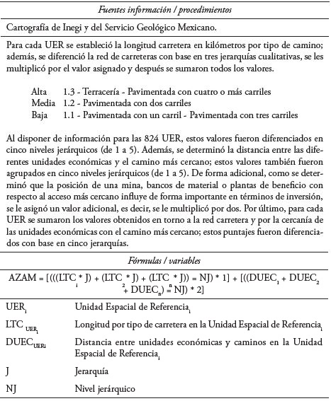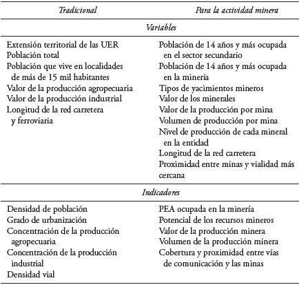 En la selección de variables, los trabajos sobre la asimilación económica han utilizado seis: una de connotación espacial, dos sobre aspectos demográficos, dos en torno a actividades económicas y una sobre infraestructura; con base en ellas se han elaborado cinco indicadores. Para la zona de estudio, el Cuadro 2 presenta las que fueron elegidas para el análisis de la minería.