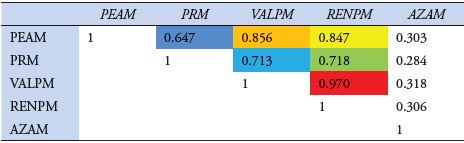 En esta investigación, para la identificación de las combinaciones, cuyos comportamientos presentan mayores similitudes, se consideró pertinente retomar los coeficientes de correlación de Spearman obtenidos a partir de los procedimientos siguientes: