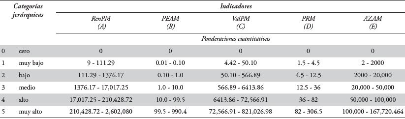 Diferenciación de los datos en cinco categorías jerárquicas: muy bajo (1), bajo (2), medio (3), alto (4) y muy alto (5); para este trabajo se introdujo la categoría: nulo o cero (0). Esto se hizo porque un espacio sin presencia de un proceso socioeconómico determinado no puede considerarse de jerarquía 1, pues ésta refiere que, aunque mínimo, existe evidencia del mismo (Castañeda Camacho, 2014 y Lara Juárez, 2010).