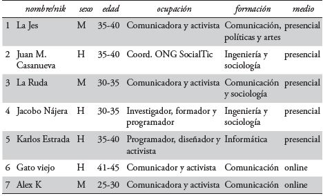Así, surge la pregunta “¿es posible considerar a Internet como un territorio?”, para dar respuesta este cuestionamiento se hizo trabajo de campo, entre 2017 y 2018; el cual consistió en la observación participante en eventos y espacios hacktivistas (presenciales) y con dos listas de correos y tres grupos de Telegram (digitales). Además, en el primer semestre de 2018 se realizaron entrevistas semiestructuradas a siete destacados participantes del activismo tecnológico o hacktivismo en México, utilizando en la mayoría de los casos seudónimo (Cuadro 1). Dichas entrevistas fueron tanto presenciales como vía online, los cuestionamientos partieron de las categorías de análisis a priori, que nos permitirían conocer, explicar y comprender el hacktivismo mexicano.