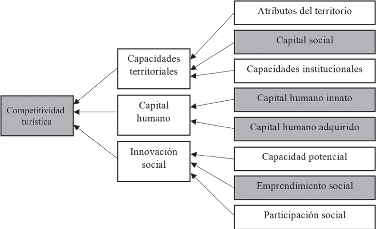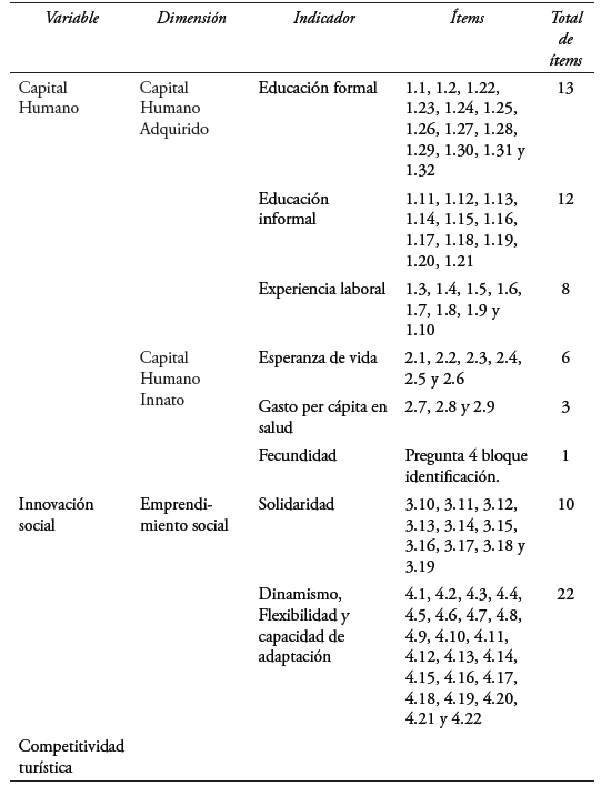 Considerando el enfoque bidimensional: sociedad y territorio, se decide medir a través de las capacidades del territorio como soporte y fundamento de la actividad, más el capital humano como el encargado de desarrollar las actividades en el territorio; además, se tiene en cuenta que el turismo es una opción posterior a un problema de carácter social; por ende, es pertinente que exista un conjunto de procesos colaborativos de participación de las personas con el objetivo de transformar y mejorar su situación a través de la co-creación de soluciones, aportación de propuestas y, preferentemente, con la aceptación de la ciudadanía, para lograr la innovación social.