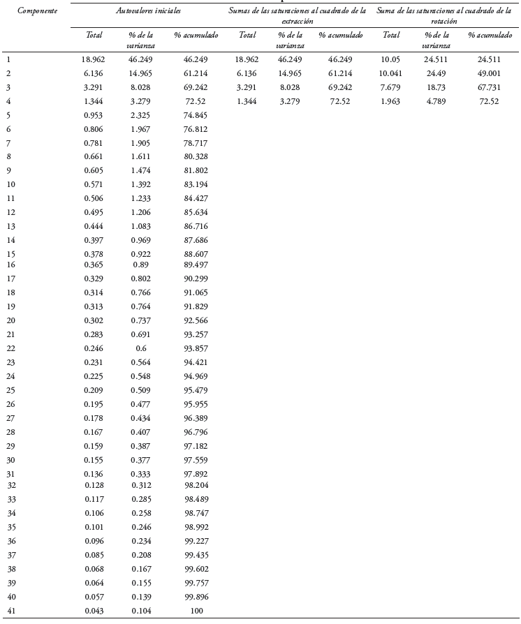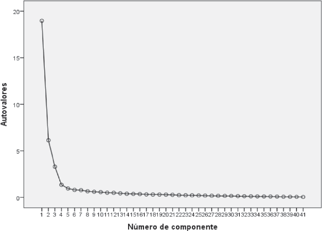 Enseguida se aplicó la técnica de extracción de factores a través del método de componentes principales, para identificar cómo los 41 ítems se agrupan en factores, para ello se generaron las comunalidades (Tabla 8), las cuales, de acuerdo a Véliz-Capuñay (2017), miden la cantidad de información que los factores comunes expresan de cada variable. De forma complementaria, el gráfico de sedimentación indica que los autovalores de las cuatro primeras variables son mayores a uno, mismas que resumen al resto coherentemente (Figura 4).