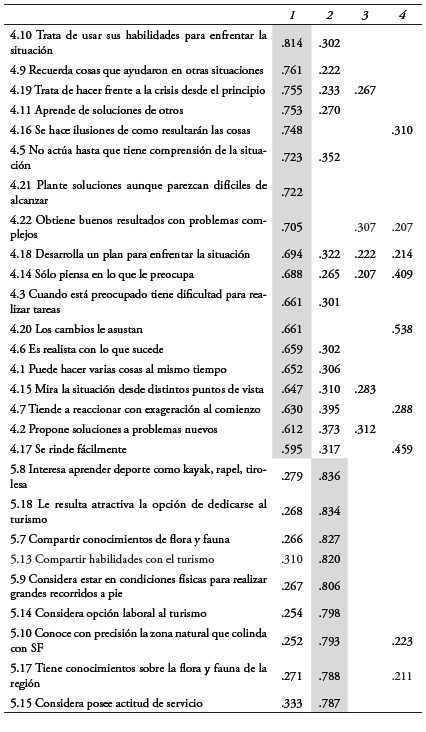 Los factores se ilustran con mayor precisión en la varianza total explicada (Tabla 9), donde se confirma que los cuatro factores explican 72.52% de la varianza, lo que significa que estos factores son relevantes para sintetizar a la totalidad de variables originales.