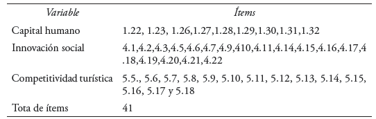 Finalmente, en la Tabla 11, se presenta el Alpha de Cronbach con un valor de 0.969 para el total de ítems, por lo que el nivel de confiabilidad es excelente de acuerdo con Mallery y Darren (1995). Para la variable competitividad turística, el Alpha fue de 0.968, mientras que para la variable innovación social alcanza un valor de 0.960, por último 0.967 para capital humano.