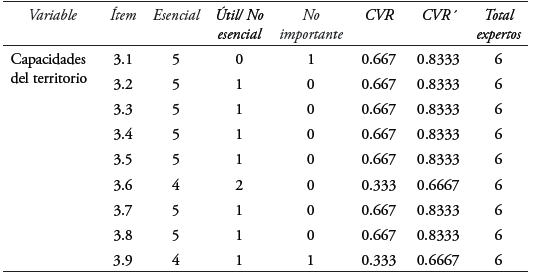 Para la variable capacidades del territorio, se presenta la Tabla 3 con su análisis de razón de validez de contenido, donde se aprecia que ningún ítem presentó un valor bajo, según la valoración de los expertos, pero de igual forma, tampoco ningún ítem presentó el valor de 1.0.