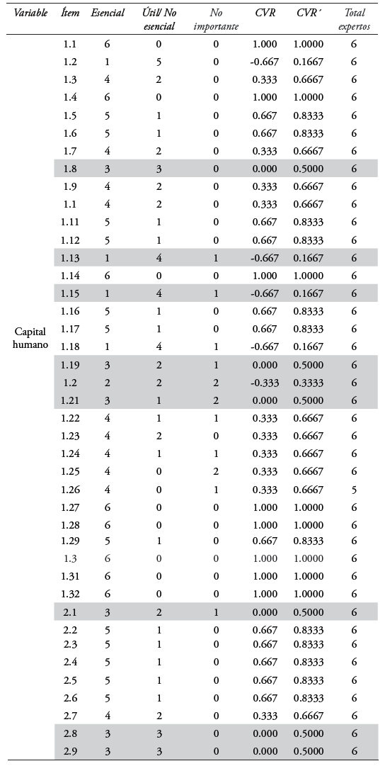 En la Tabla 4 se muestra la valoración y la razón de validez de contenido de la variable capital humano; en gris se resaltan aquellos ítems, cuya razón fue menor al valor de 0.58, encontrándose un total de nueve ítems cuya razón de validez de contenido fue menor al valor establecido por Tristán-López (2008), mientras que siete ítems presentan el valor máximo de 1.00 al ser evaluados como esenciales por los seis expertos. Cabe mencionar que las primeras 21 preguntas fueron diseñadas con el fin de describir las características del capital humano, más no con la intención de medirlo, por lo que el juicio de los expertos va con relación a que dichas preguntas, efectivamente, no miden a la variable en cuestión. Para el análisis factorial posterior, dichos ítems no fueron incluidos.